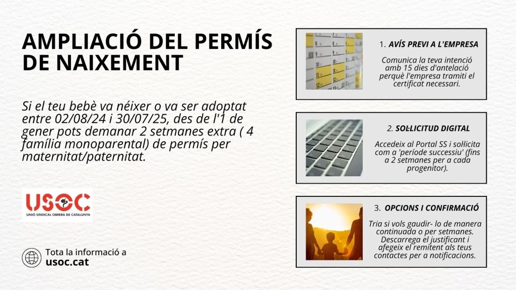 Si el teu bebè va néixer o va ser adoptat entre 02/08/24 i 30/07/25, des de l’1 de gener pots demanar 2 setmanes extra (4 família monoparental) de permís per maternitat/paternitat.