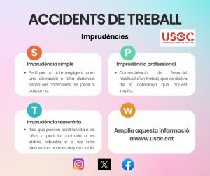 A la USOC considerem que és important que tant les persones treballadores com els delegats de prevenció i el Comitè de Seguretat i Salut disposin d’aquesta informació. Si un accident de treball ha pogut ser conseqüència d’una imprudència, les Mútues tendeixen a intentar adjudicar la qualificació d’imprudència temerària per a eximir a l’empresa de responsabilitat, especialment si és greu. Depenent del tipus d’imprudència que ens puguin atribuir, podem tenir dret a unes cobertures assistencials i econòmiques diferents.